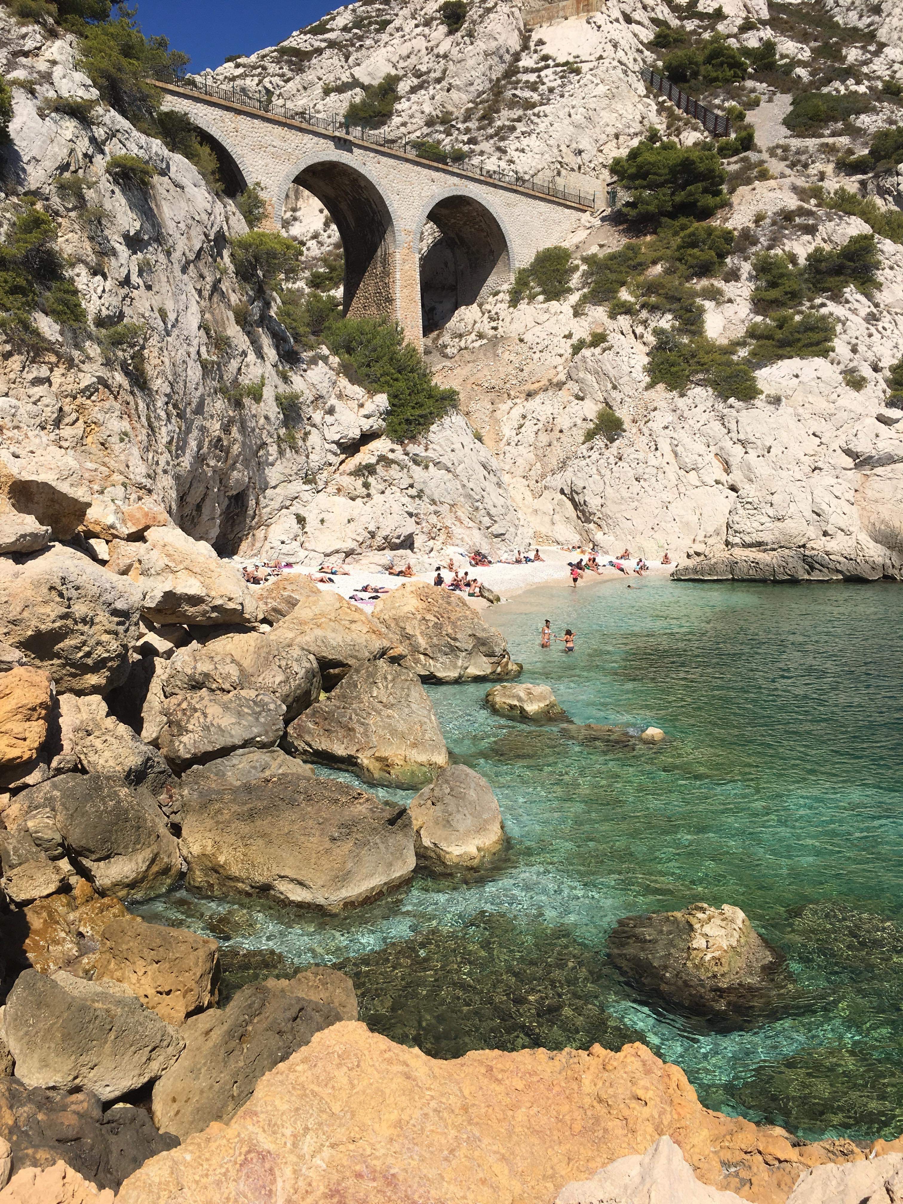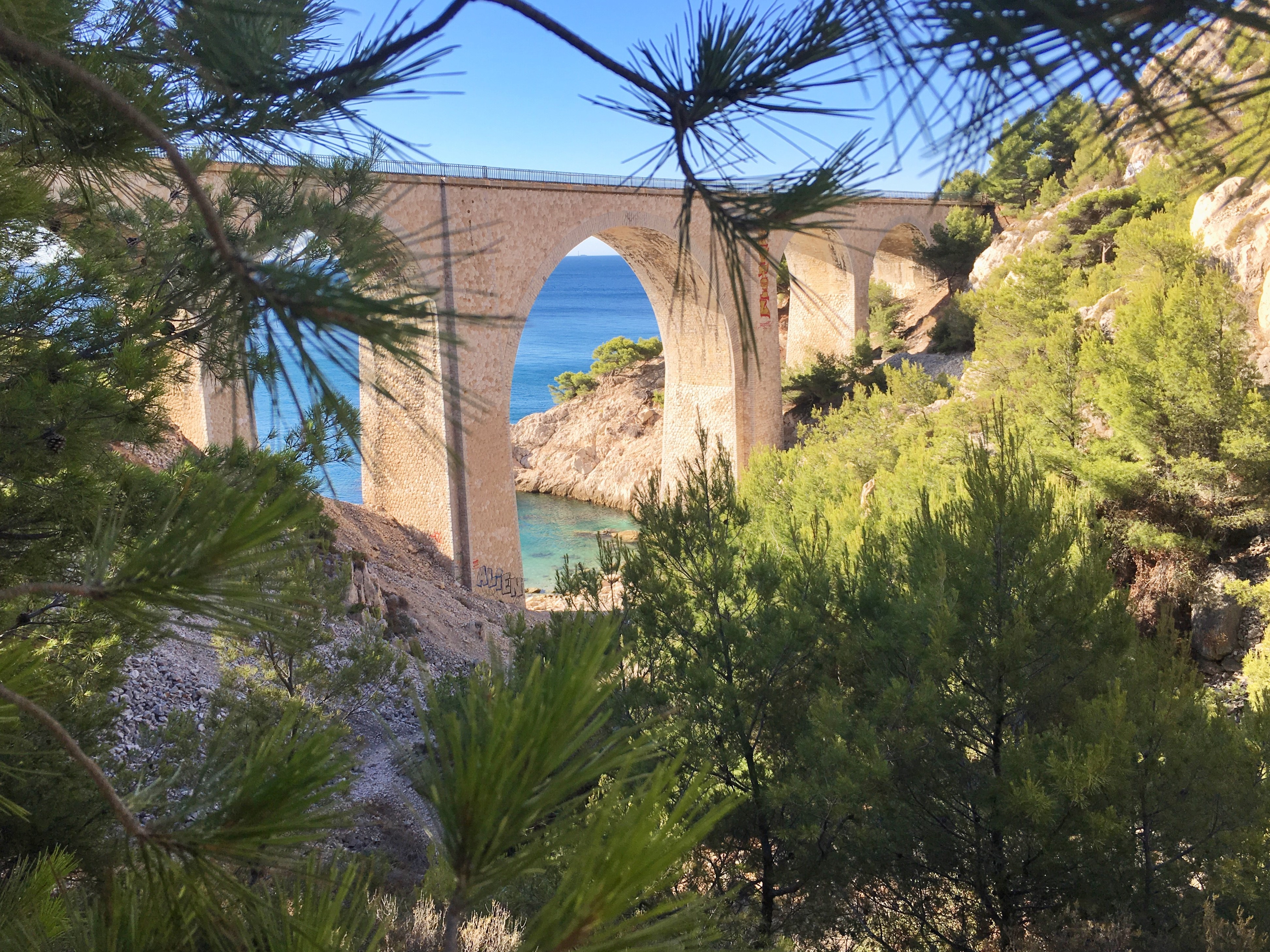 Pour notre dernier jour nous avons décidé d’aller visiter la Côte Bleue, située au Nord de Marseille. Bien moins connue que le Parc National des Calanques, elle en vaut tout autant le détour. Pour se rendre sur la Côte Bleue il faut prendre le TER en direction de Miramas à la Gare Marseille Saint-Charles. Le trajet en train en lui même est déjà impressionnant, car il longe la côte, alternant entre passages souterrains et aqueducs ! Le billet coûte environ 3-4€ et le trajet dure une trentaine de minutes. Nous avons choisi de descendre à l’arrêt Niolon avec l’objectif de nous rendre à la calanque de l’île de l’Everine en empruntant le Sentier des Douaniers. Le début du sentier se situe près de la gare. Bien qu’il soit globalement bien balisé, nous avons dû, à certains endroits, utiliser le site Marseille Tourisme pour nous repérer.
