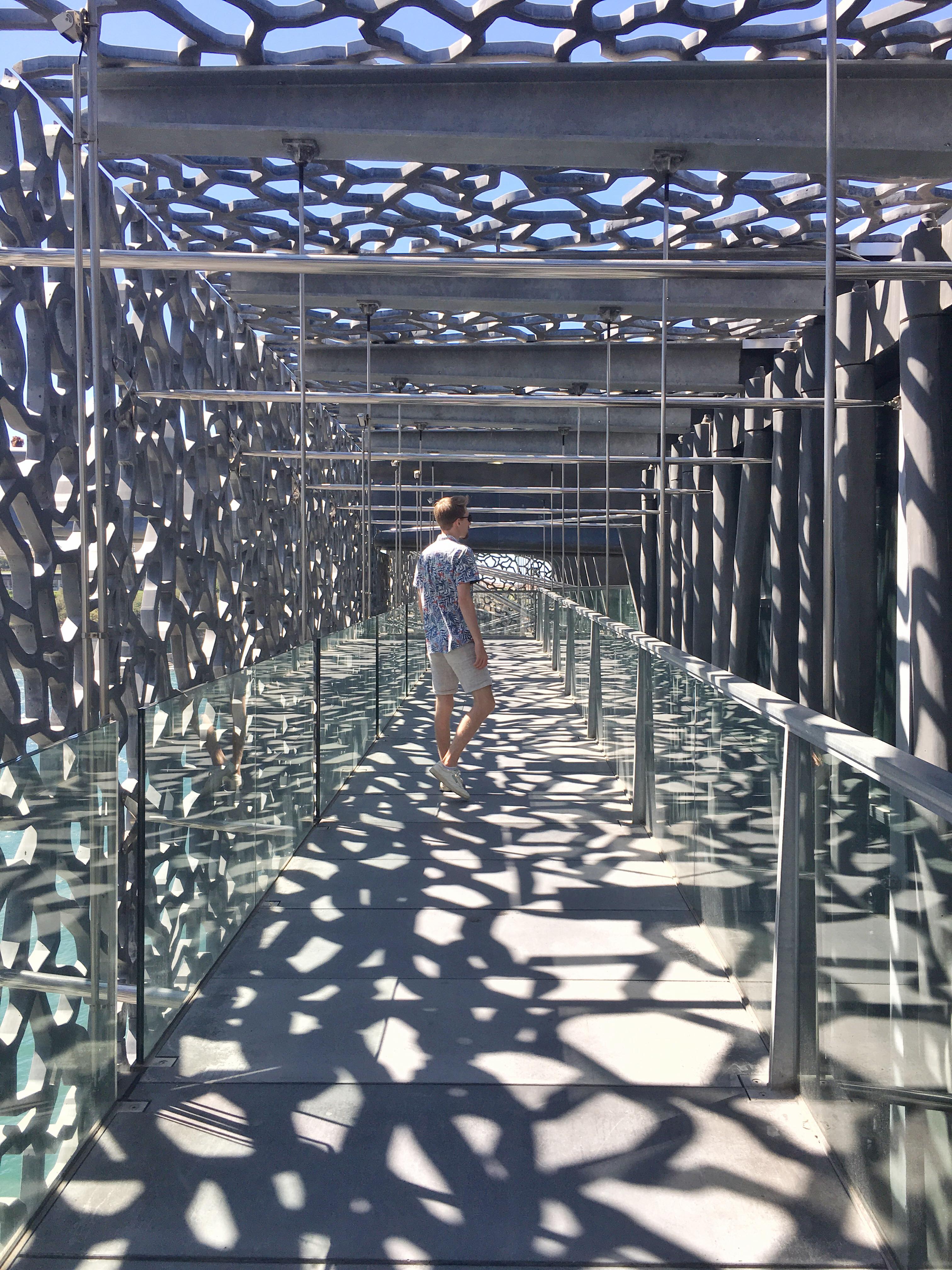 Le MUCEM est intégré dans le Fort Saint Jean et il est donc possible d’y entrer gratuitement pour déambuler dans celui-ci. En le parcourant vous découvrirez les différents points de vue qu’il offre sur la ville de Marseille et le Vieux Port. Les terrasses ont été aménagées et l’on peut s’asseoir sur du mobilier en bois qui s’intègre parfaitement avec les oliviers plantés un peu partout dans le fort. Pour arriver à l’endroit dit “instagramable” du MUCEM, il faut emprunter la passerelle pour se rendre au P4.