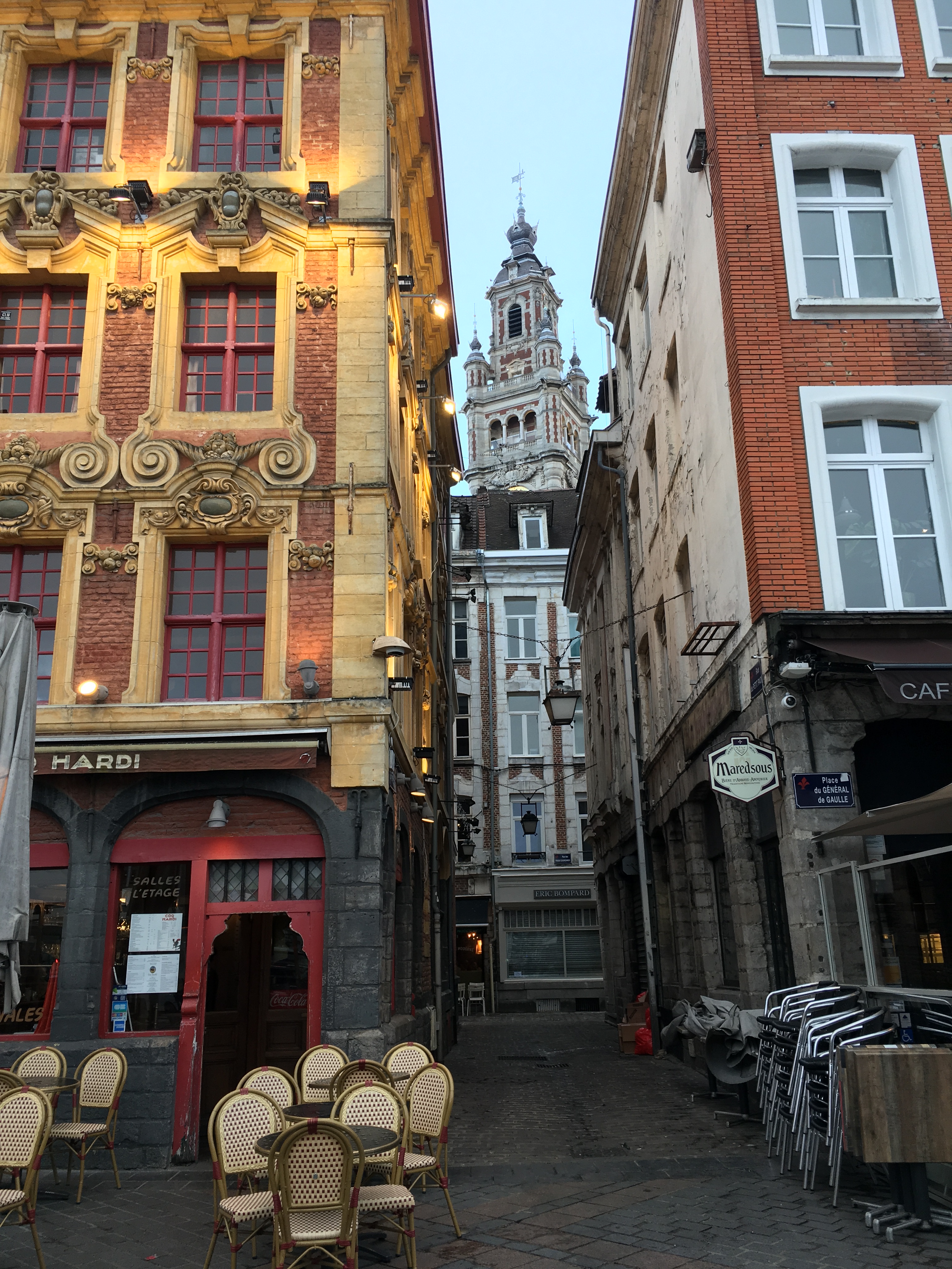 Depuis la place on peut apercevoir le somptueux beffroi de la Chambre de Commerce et d’Industrie. On a découvert plus tard qu’en réalité il n’y avait pas un, mais deux beffrois à Lille. Celui de la Chambre de Commerce et d’Industrie et celui de l’Hôtel de Ville. Le beffroi qui se visite se trouve près de l’Hôtel de Ville de Lille. Attention donc à ne pas faire comme nous et à ne pas confondre les deux…
