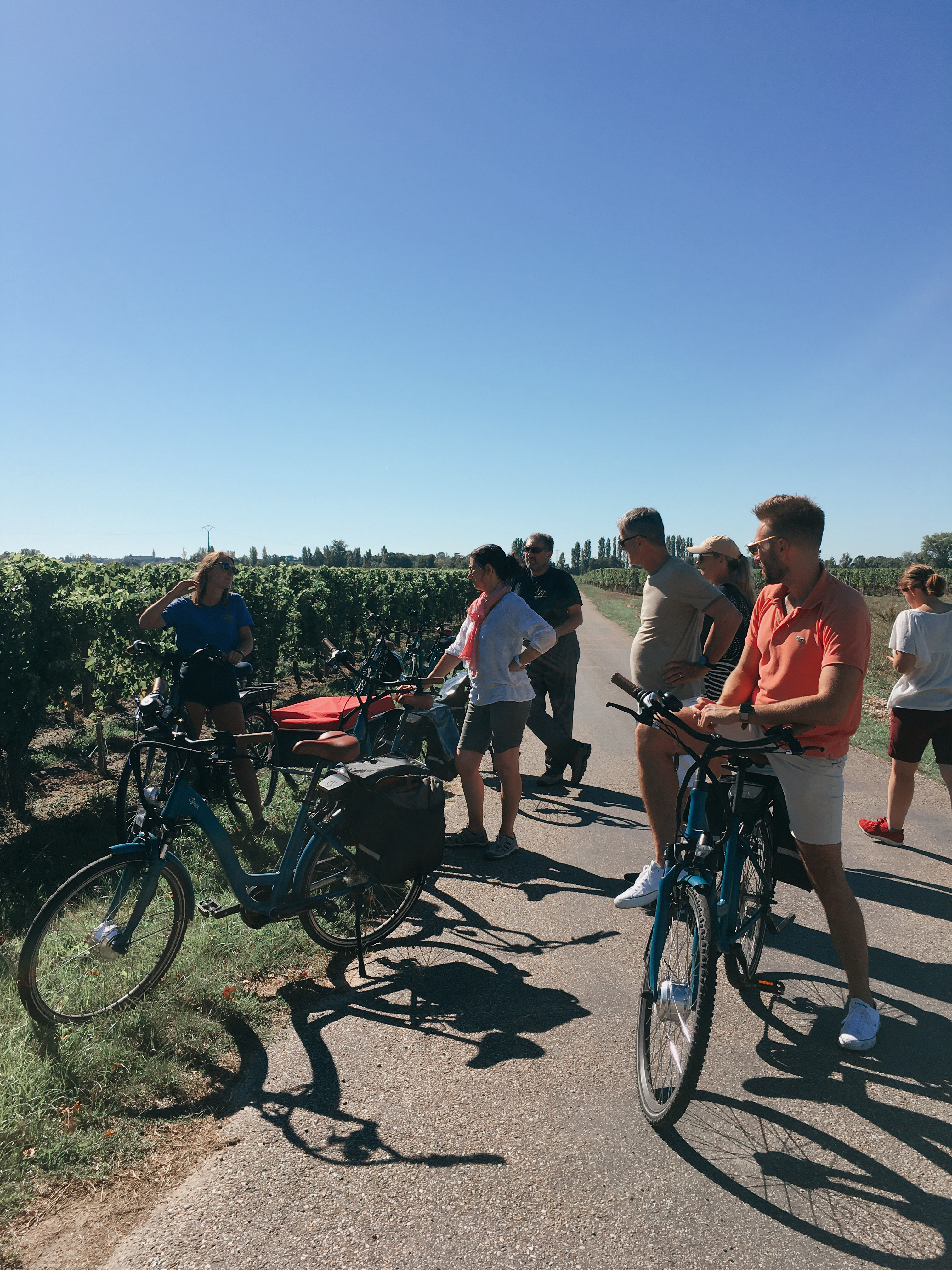 L’excursion a duré une journée entière (10h-17h) et nous a permis de découvrir des coins que nous ne connaissions pas du tout. Au programme de la journée : balade guidée en vélo électrique, 2 visites de châteaux avec dégustation, ponctué par un pique-nique de produits locaux dans un joli parc arboré d’une propriété, et conclu par une découverte du village de Saint-Émilion.