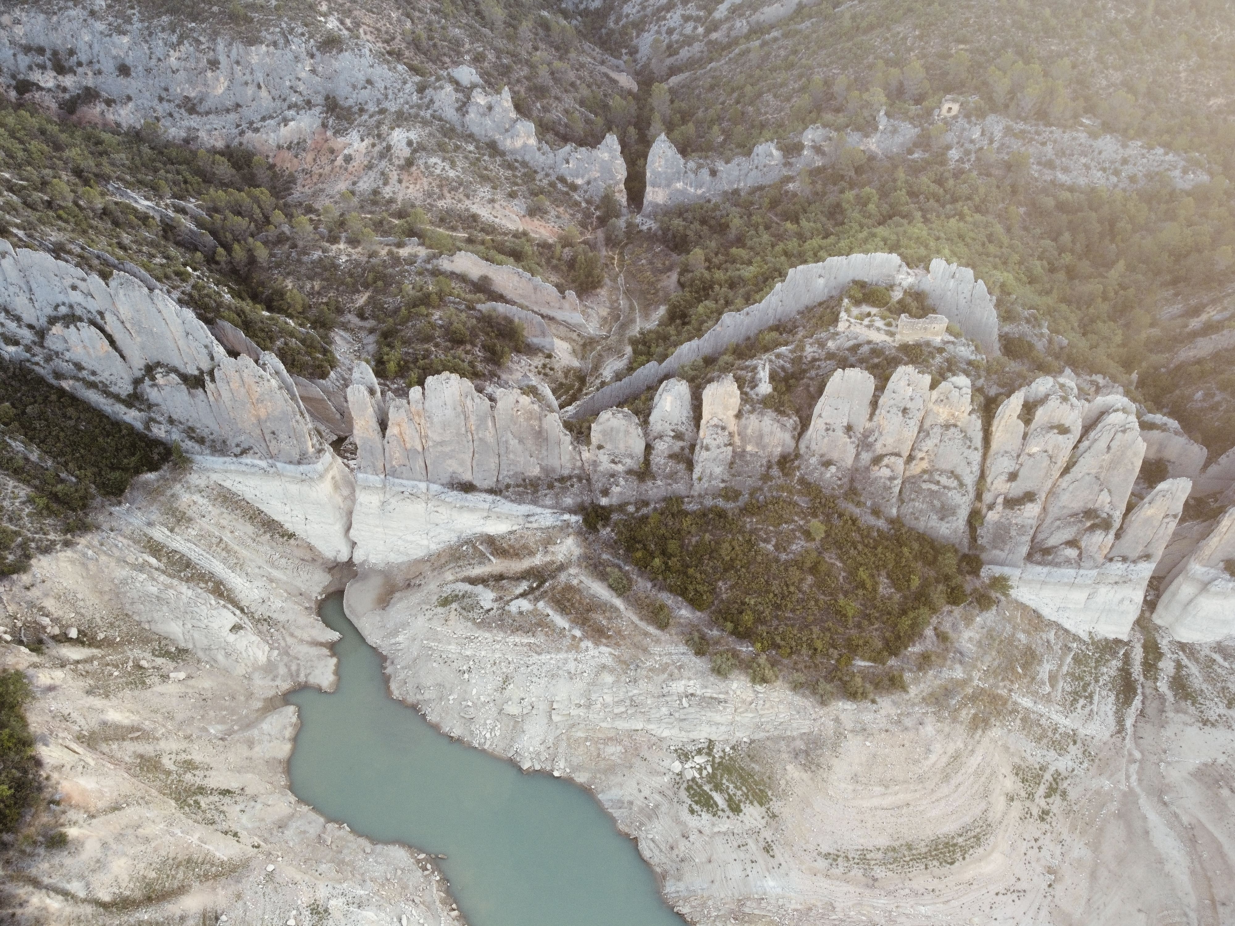 La Muraille de Finestras est une merveille géologique du Crétacé (-145,5 millions d’années à -65,5 millions d’années) formée par des rochers calcaires. Les couches sont nées à partir d’un effet tectonique et se sont effritées lors du passage de milliers d’années. Donnant pour résultat les deux grandes parois parallèles s’étendant sur environ 500 mètres et formant un mur d’écailles au bord d’un immense lac à la couleur turquoise. Au milieu des deux roches, on peut encore apercevoir les ruines du château médiéval et de la chapelle San Vincente.