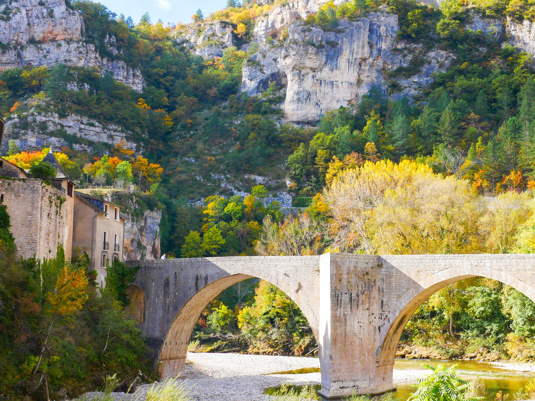 Première étape de notre road-trip automnal en Lozère : le village de Pont-De-Montvert. Sur les bords du Tarn, Pont-De-Montvert est une halte bien sympathique avec ses maisons de granit, ses piscines naturelles formées par le Tarn et ses couleurs automnales.