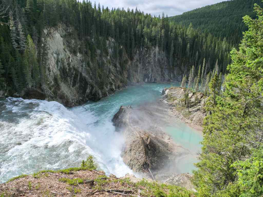 Les Chutes Wapta, une très belle chute d’eau de 18 mètres de haut et 107 de large au débit impressionnant. L’aller-retour de 4,8 km dans la forêt est de niveau facile. On arrive rapidement à un belvédère en hauteur puis on a la possibilité de descendre pour voir la chute de plus près.