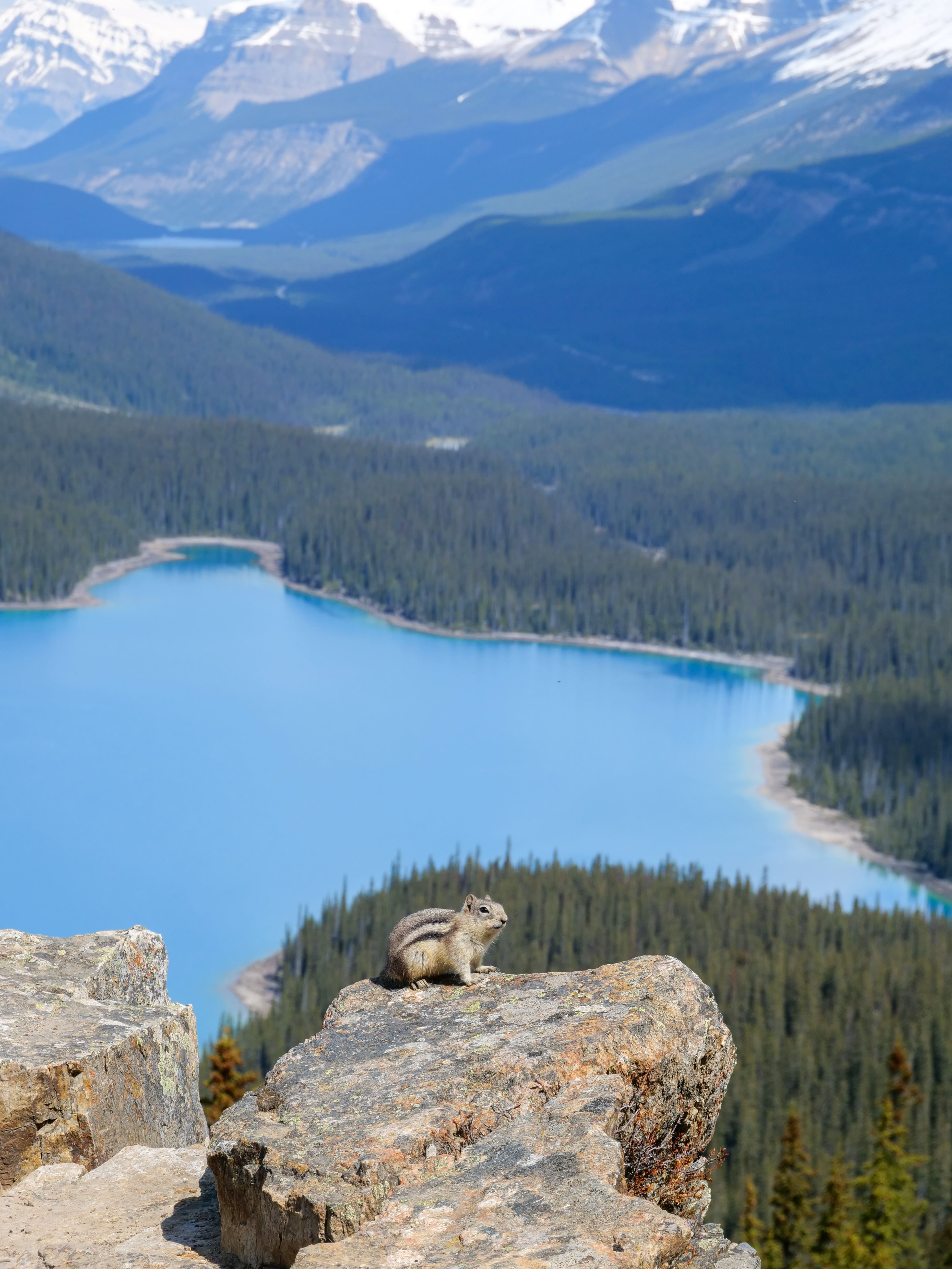 Le Lac Peyto : un lac qui rentre directement dans notre top 3 des plus beaux lacs des Rocheuses. Avec sa forme distincte de tête de renard et sa couleur bleue pétante, c’est un arrêt incontournable sur la Promenade des Glaciers. Lorsque vous êtes au belvédère, prenez le chemin sur la gauche qui mène à une plus longue randonnée. Au bout de quelques mètres tournez à droite devant le panneau bleu “un pas de côté” avec la photo des rongeurs. Ici il n’y a personne et la vue est somptueuse.