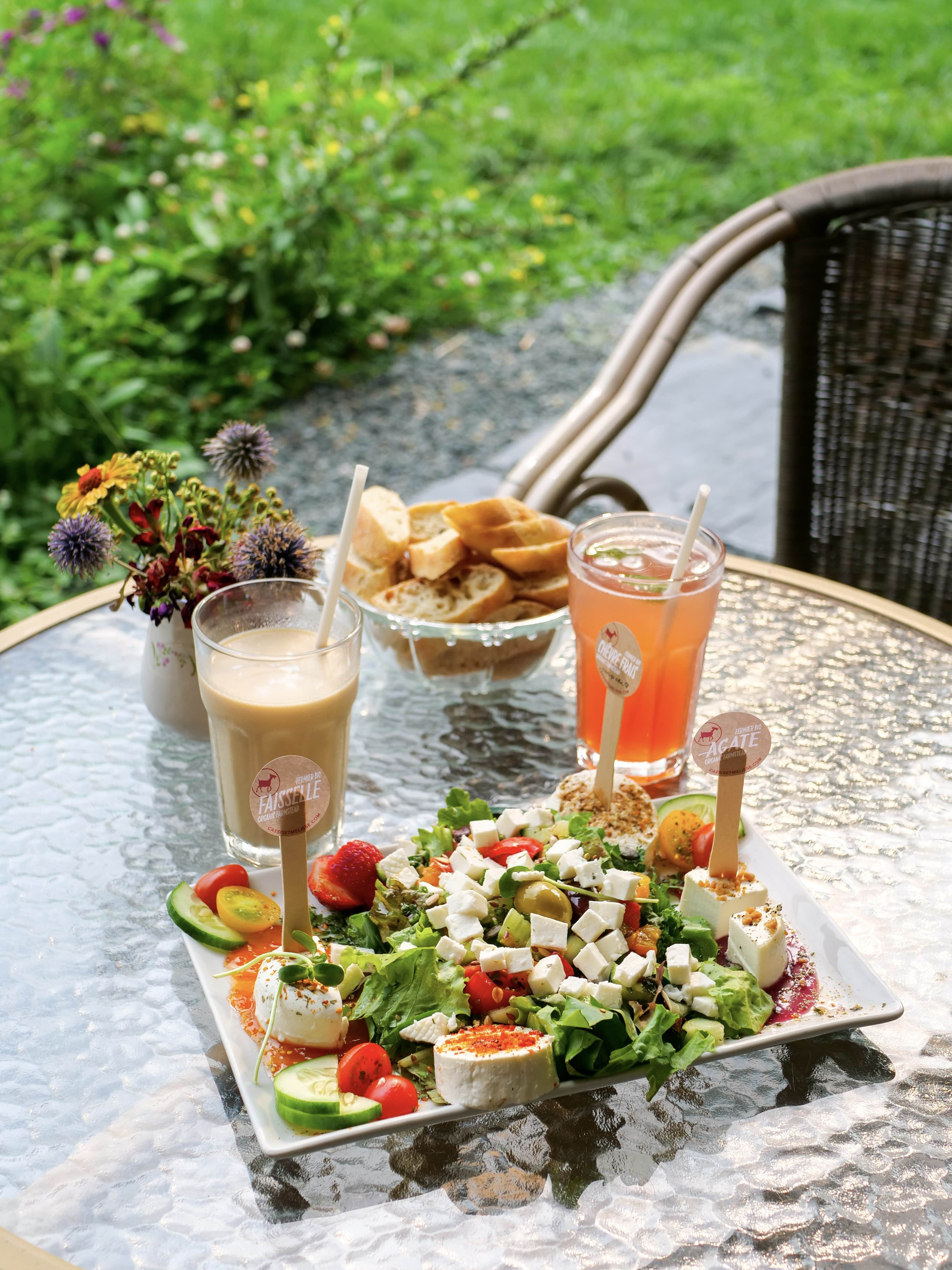 J’ai opté pour le plateau dégustation avec plusieurs fromages de chèvre, de la faisselle et une salade avec les produits du jardin agrémentée de feta. Exquis ! Accompagné d’une limonade maison et d’un latte glacé au lait de chèvre qui n’a pas quitté mon esprit depuis ma visite chez Cassis et Mélisse.