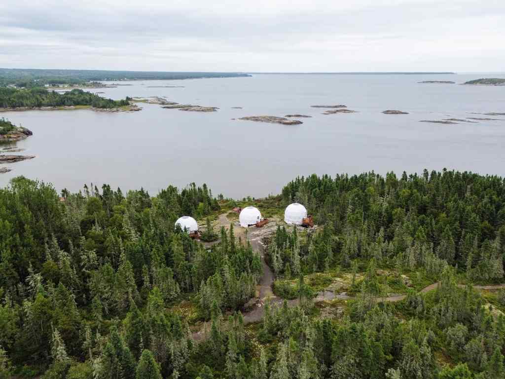 C’est dans cet endroit enchanteur que sont installés depuis janvier 2024 les dômes de En Fôret. Avec leur vue imprenable sur le fleuve, ces trois dômes sont parfaits pour une nuit insolite en Côte-Nord.