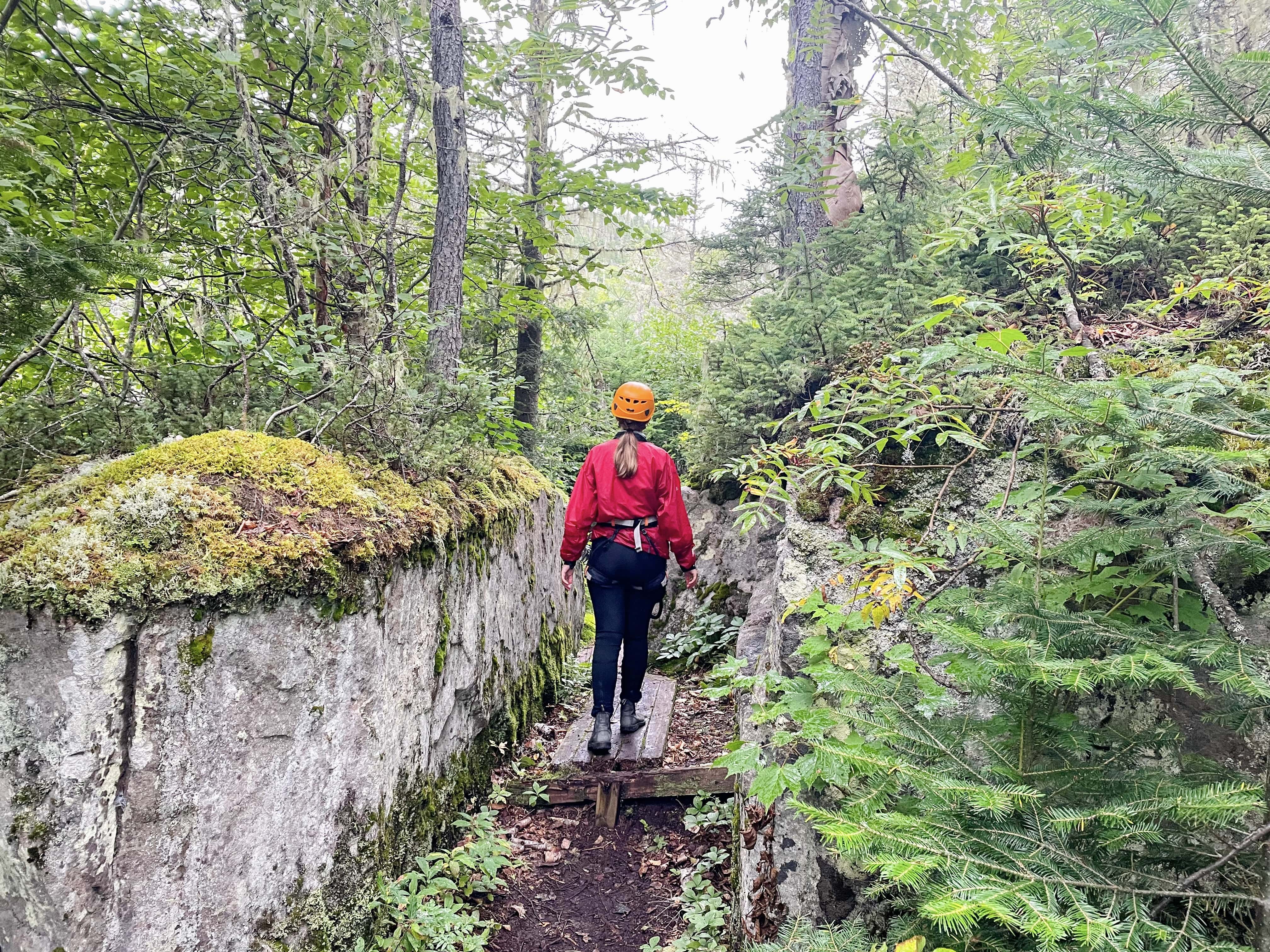Mais ce n’est pas fini ! En plein milieu de la sortie, Jo fait débarquer le petit groupe sur un quai, remettre nos souliers et nous équiper car la deuxième partie de l’activité s’en vient : deux tyroliennes au-dessus de la baie pour se dégourdir les pattes.
