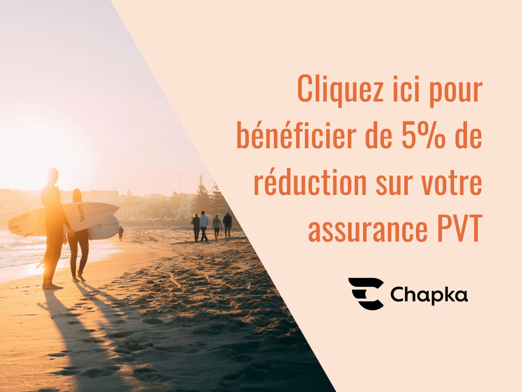 Nous avons un code de réduction pour payer moins cher votre assurance lors de votre PVT en Australie. En cliquant sur l’image ci-dessous vous bénéficierez de 5% de réduction immédiate sur votre contrat.